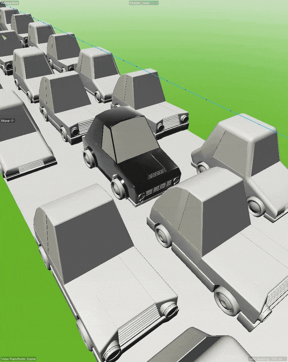 I layered paint textures over a painterly base from Substance Painter, making the red car stand out through both its vibrant color and stylized look.