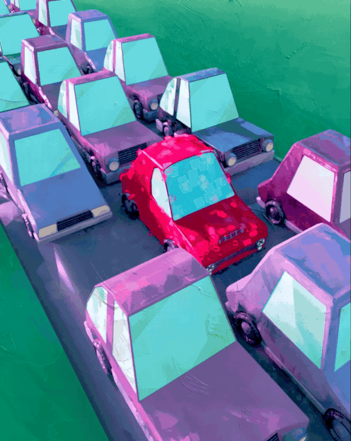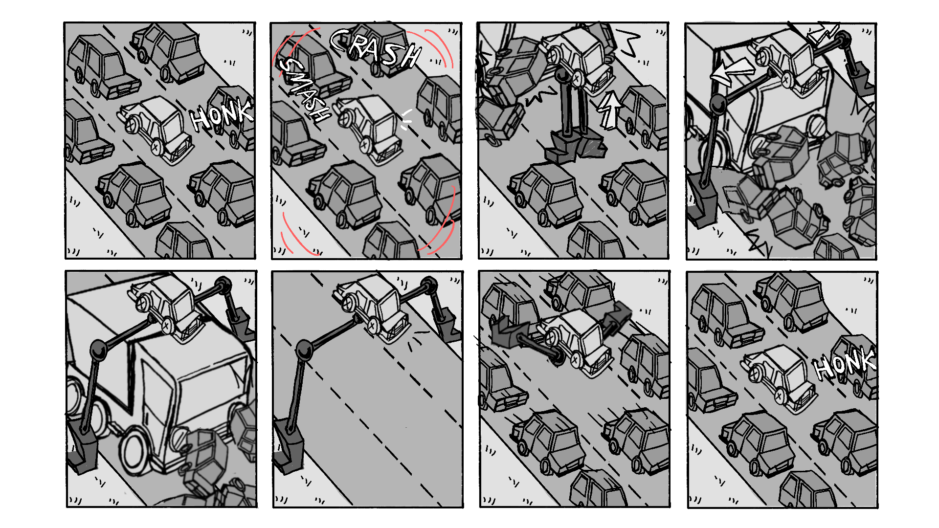 Stuck in traffic, a car grows impatient, honking nonstop, until a giant truck crashes through, running over the cars behind. To escape, the car sprouts legs and lets the truck pass beneath. Relieved, it celebrates, only for the traffic to reset beneath it, restarting the loop.