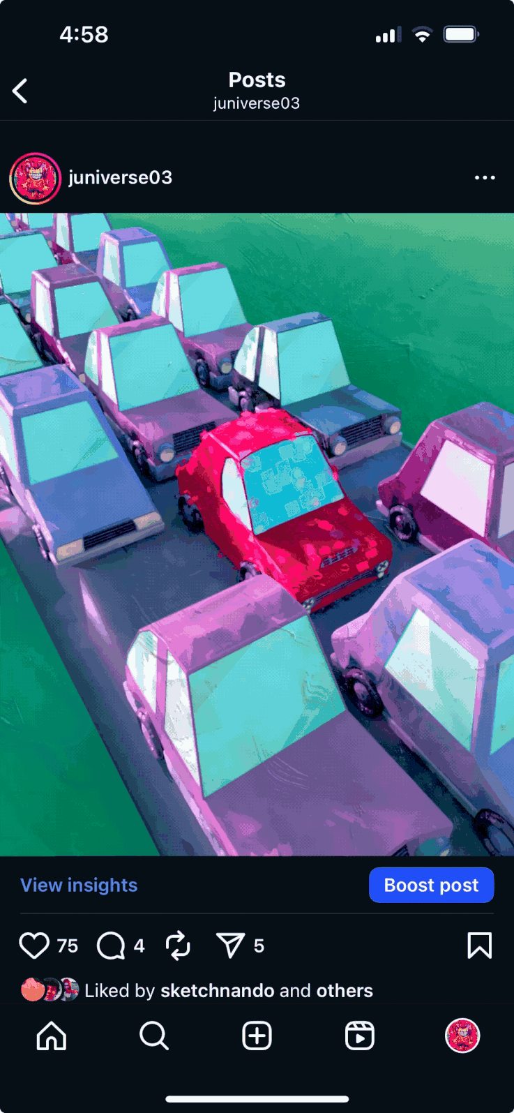 By stepping out of my comfort zone in Redshift, I aimed to create a painterly, energetic texture. Combined with the fun, expressive animation and short length, it’s designed to grab attention and hold it while people scroll through social media.