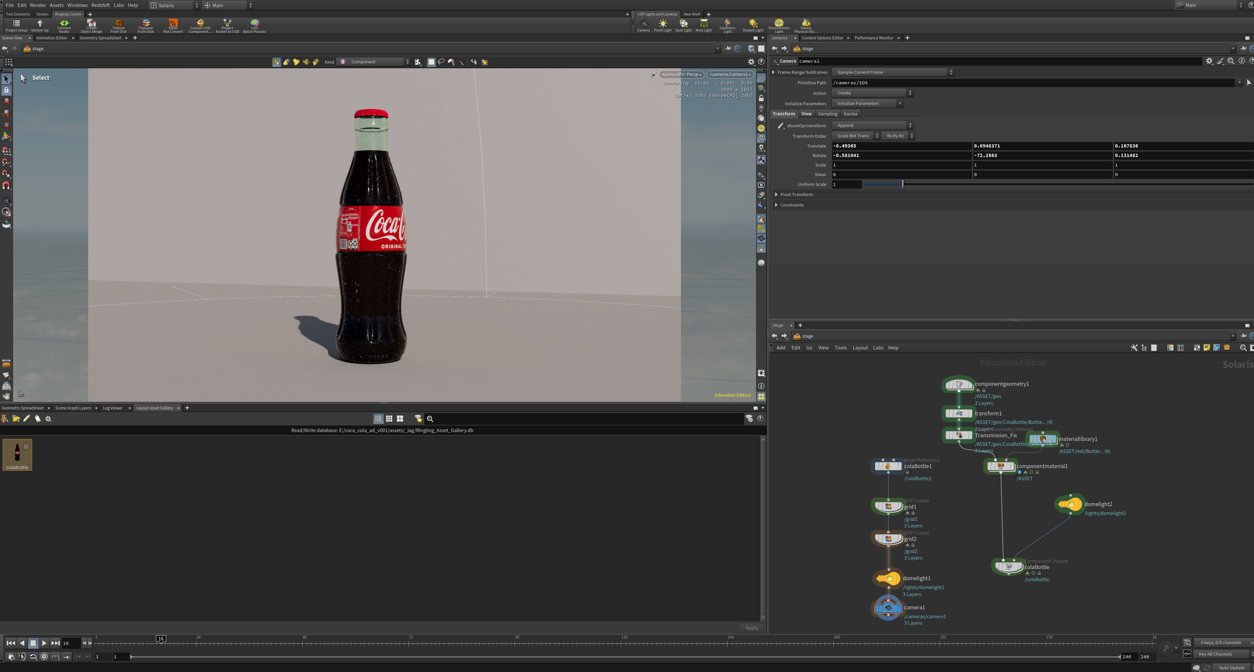 This shows the Coca-Cola bottle in Houdini with shaders and lighting applied. The bottle rotation highlights how the HDRI lighting effects the the model. The HDRI rotation (in the background) shows how the bottle looks under different light positions and angles.